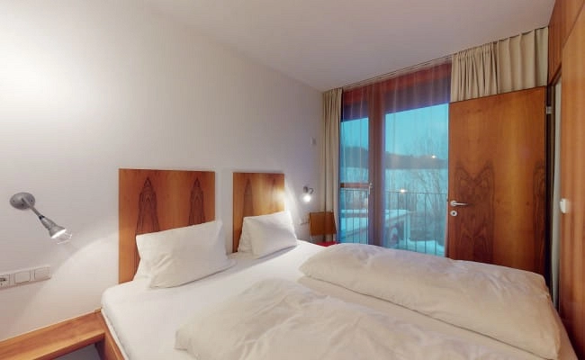 Helle 3 Zimmerwohnungen mit großem Wohn-/Essraum. Die Apartments befinden sich im Erdgeschoss oder 1. Stock mit Terrasse. Kalkstein- und Kaiserblick durch die vollverglasten Ost- und Westwände. Die Ausstattung: Zwei separate Schlafzimmer mit Überlängen-Doppelbetten. Sofalandschaft mit neuem kleinen TV. Das Bad bietet Badewanne mit Dusche. Die Küche ist ausgestattet mit Kühlschrank und kleinem Gefrierfach, Mikrowelle mit Backfunktion, Geschirrspüler, zwei Herdplatten, Bar und ausziehbarem Esstisch zentral im Hauptraum.