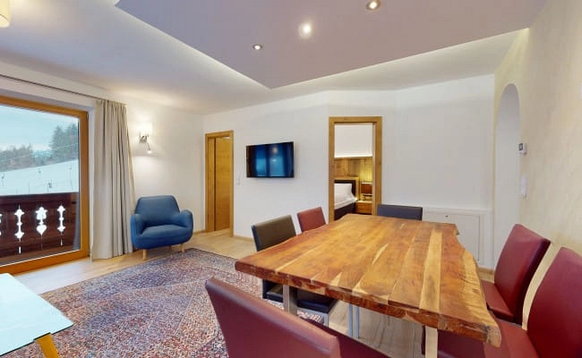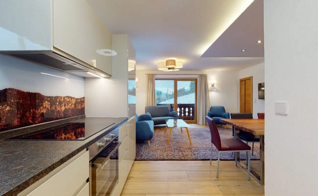 Große Apartments mit Blick Richtung Wildem Kaiser und Kalkstein. Diese großen 5 Zimmer Wohnungen können sowohl als Feriengast wie auch als Freizeitwohnsitz und temporärer Fixmieter bezogen werden. Der doppelte Eingangsbereich in Altholz verkleidet bietet viel Stauraum für Ski- und Sportbekleidung. An die Garderoben grenzen zwei hochmoderne Badezimmer mit Dusche und zwei separaten WCs im großformatigen Marmorlook. Das große helle Wohnzimmer ist ausgestattet mit gemütlichen Sofas, XXL-TV und Esstisch.